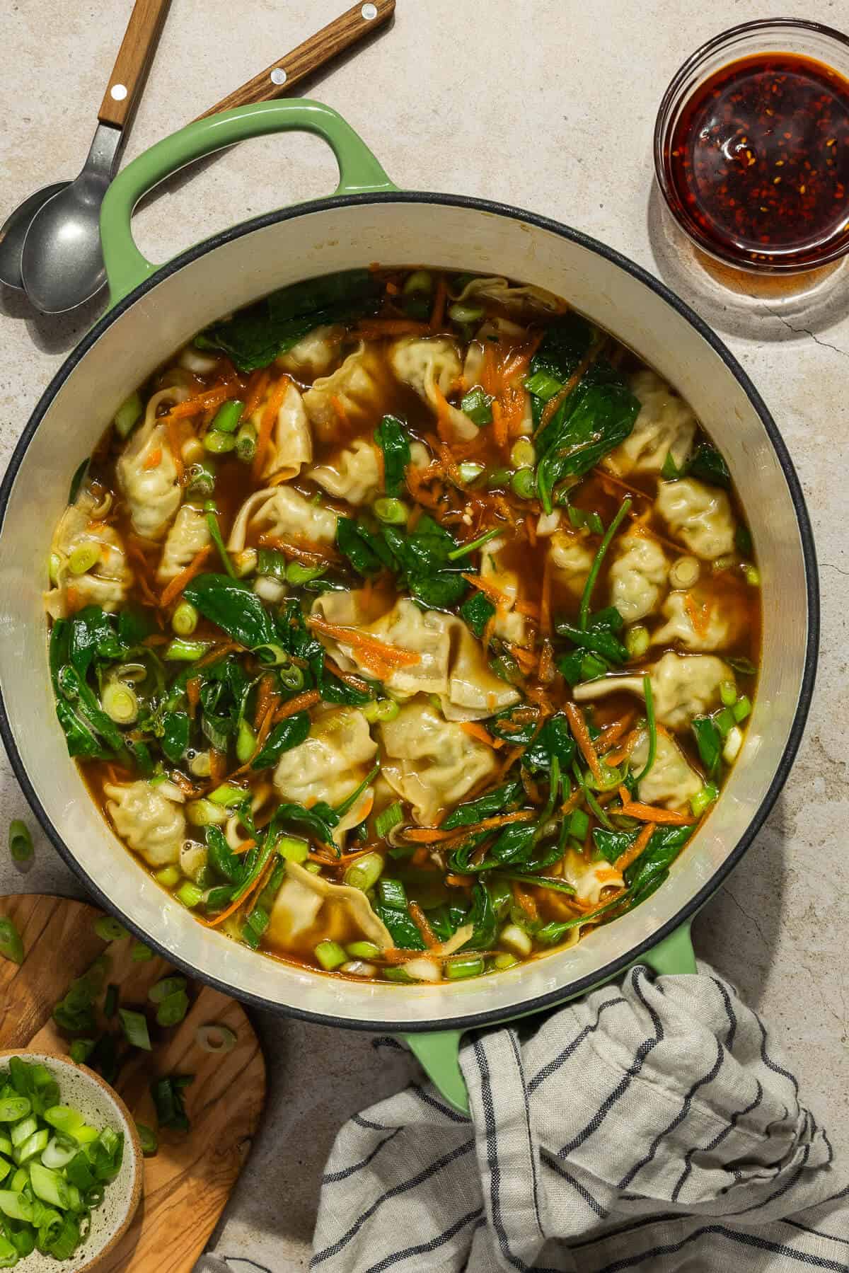 - Don’t boil aggressively. Keep the soup at a gentle simmer so the wontons stay tender and don’t break apart at the bottom of the pot.